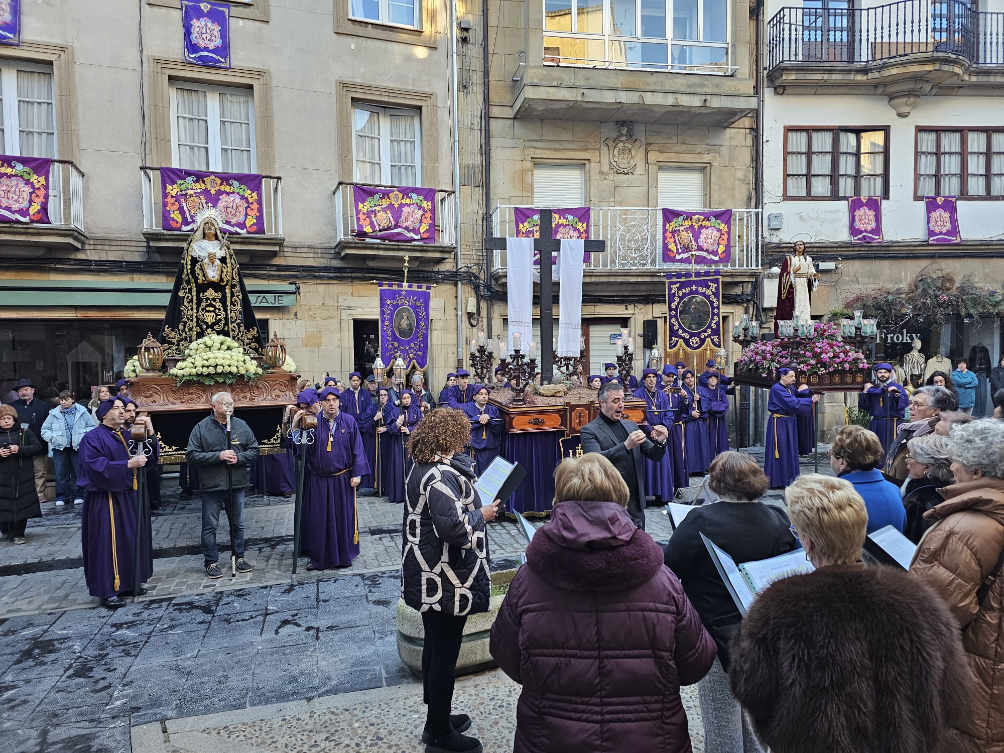 A lo largo del recorrido por las calles céntricas de la Villa, decenas de cofrades, vecinos y fieles acompañaron la procesión en silencio, en una estampa que cada año refuerza el carácter íntimo de esta celebración. El itinerario culminó en la plaza del Crucero, en la calle del Sol, donde tuvo lugar uno de los instantes más esperados: la interpretación del “Stabat Mater” a cargo de la Coral Capilla de la Torre, con todos los pasos alineados, ofreciendo una imagen de gran fuerza simbólica.