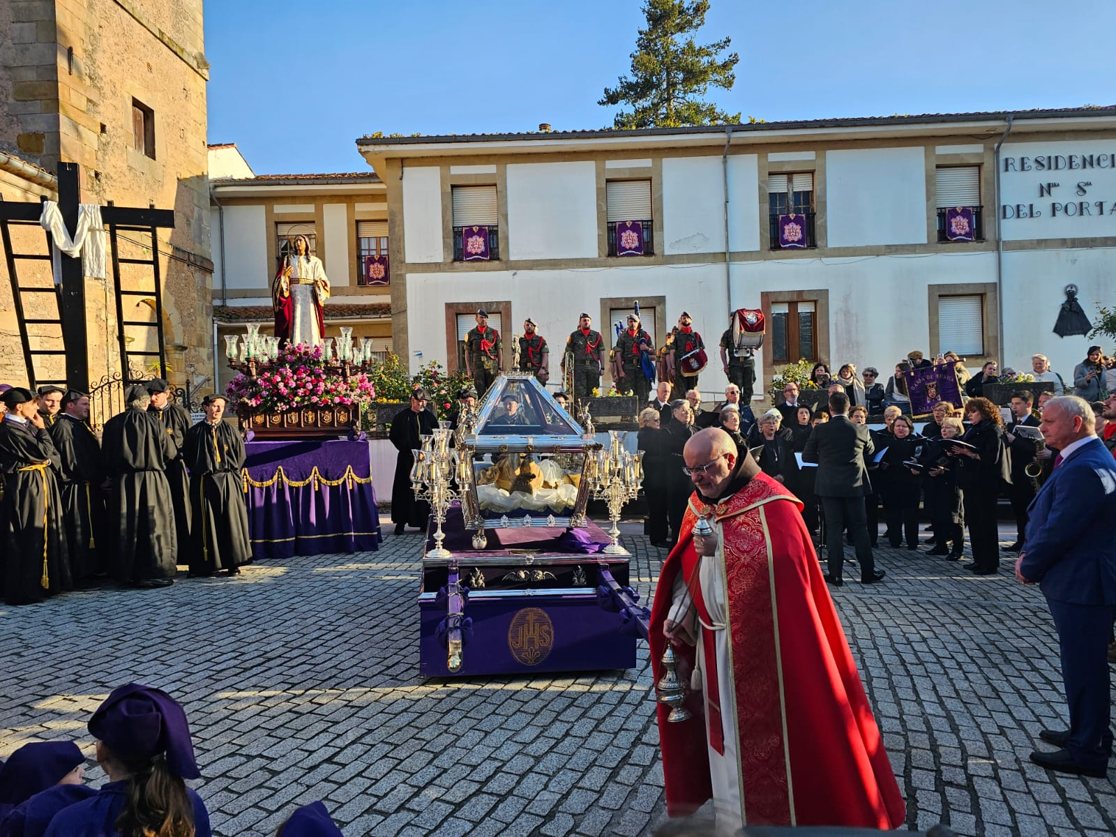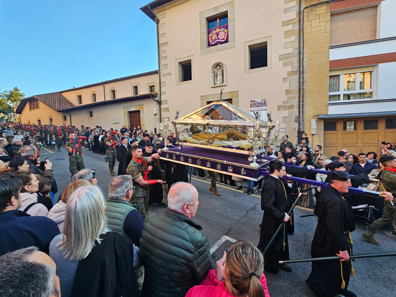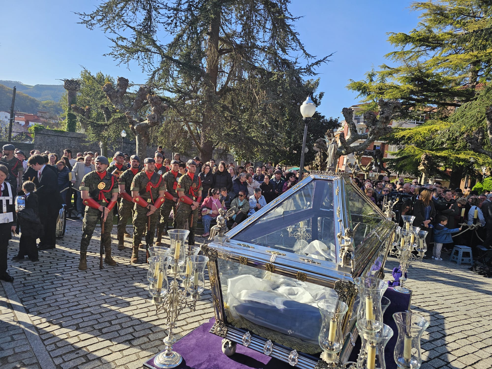Tras el sermón, las calles de Villaviciosa acogieron la Procesión del Santo Entierro, uno de los actos más solemnes de la Semana Santa maliaya. La música de la Coral Capilla de la Torre, la Banda de Música de Villaviciosa y la Banda de cornetas del Regimiento Príncipe Nº III acompañó el recorrido, aportando un marco sonoro que elevó aún más la emoción del momento