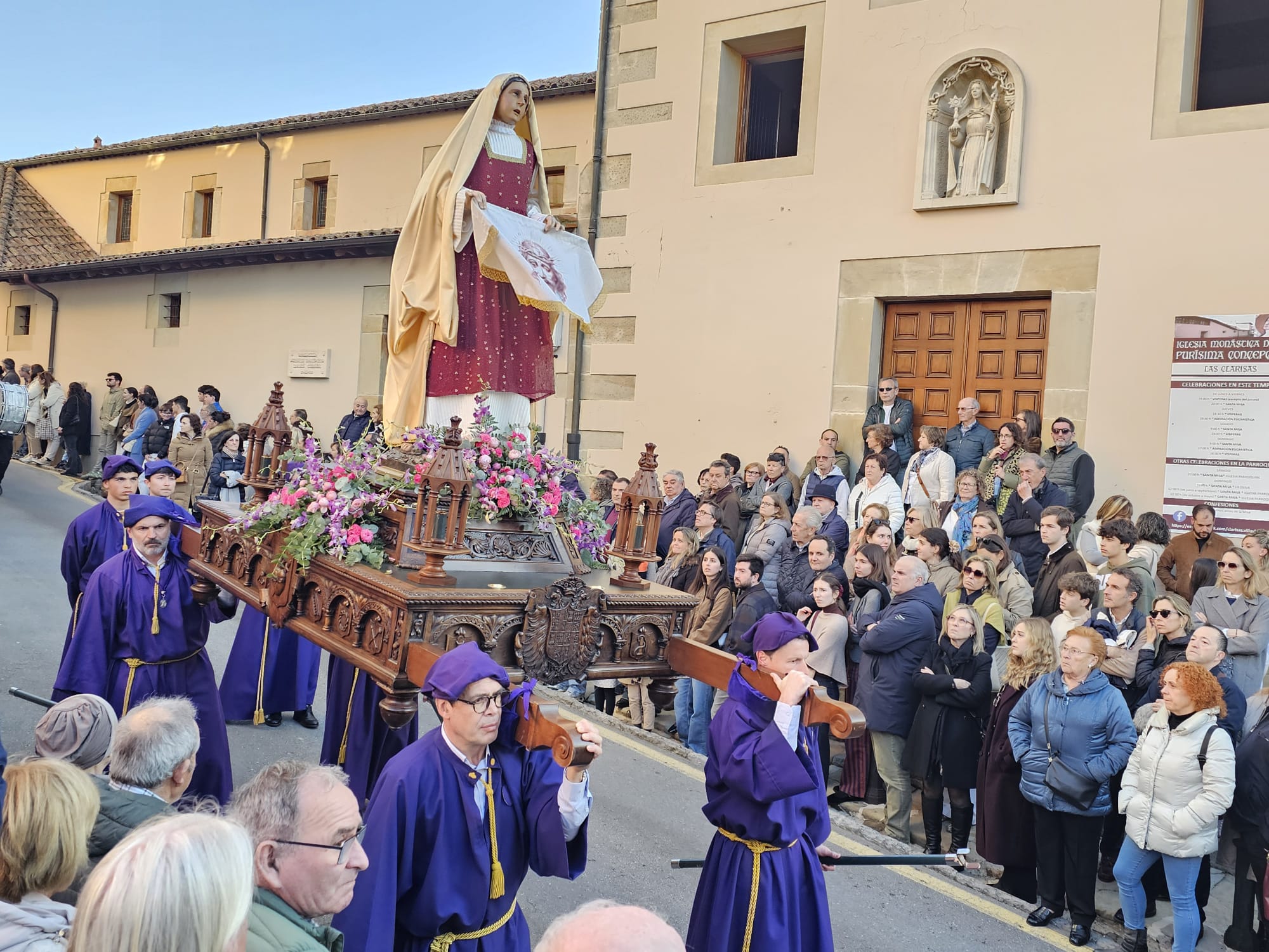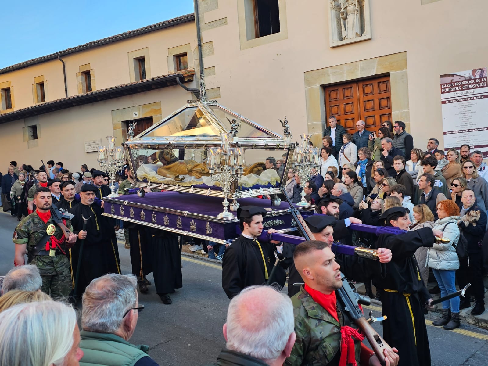 La mañana comenzó a las 12.30 h en la Iglesia Parroquial con la celebración litúrgica de la Muerte del Señor, acompañada por el Coro Parroquial. A las 17.00 h, las Clarisas acogieron la misma ceremonia en un ambiente de recogimiento y silencio.