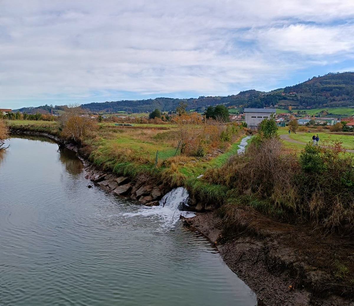 Una pequeña cascada temporal sorprendió este fin de semana junto al puente que conduce al parque de Riaño, en Villaviciosa, dejando una estampa natural que atrajo la mirada de paseantes.
