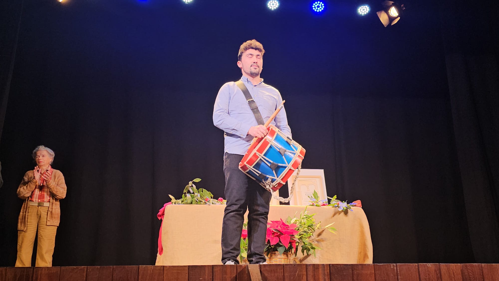 En su turno de palabra, Edu Llosa pasó de unas breves palabras de agradecimiento a la interpretación de una pieza de un histórico tamboritero "Serafín el de Quintes" de Les Mariñes rescatada en sus investigaciones. (lo veis en un video inferior)