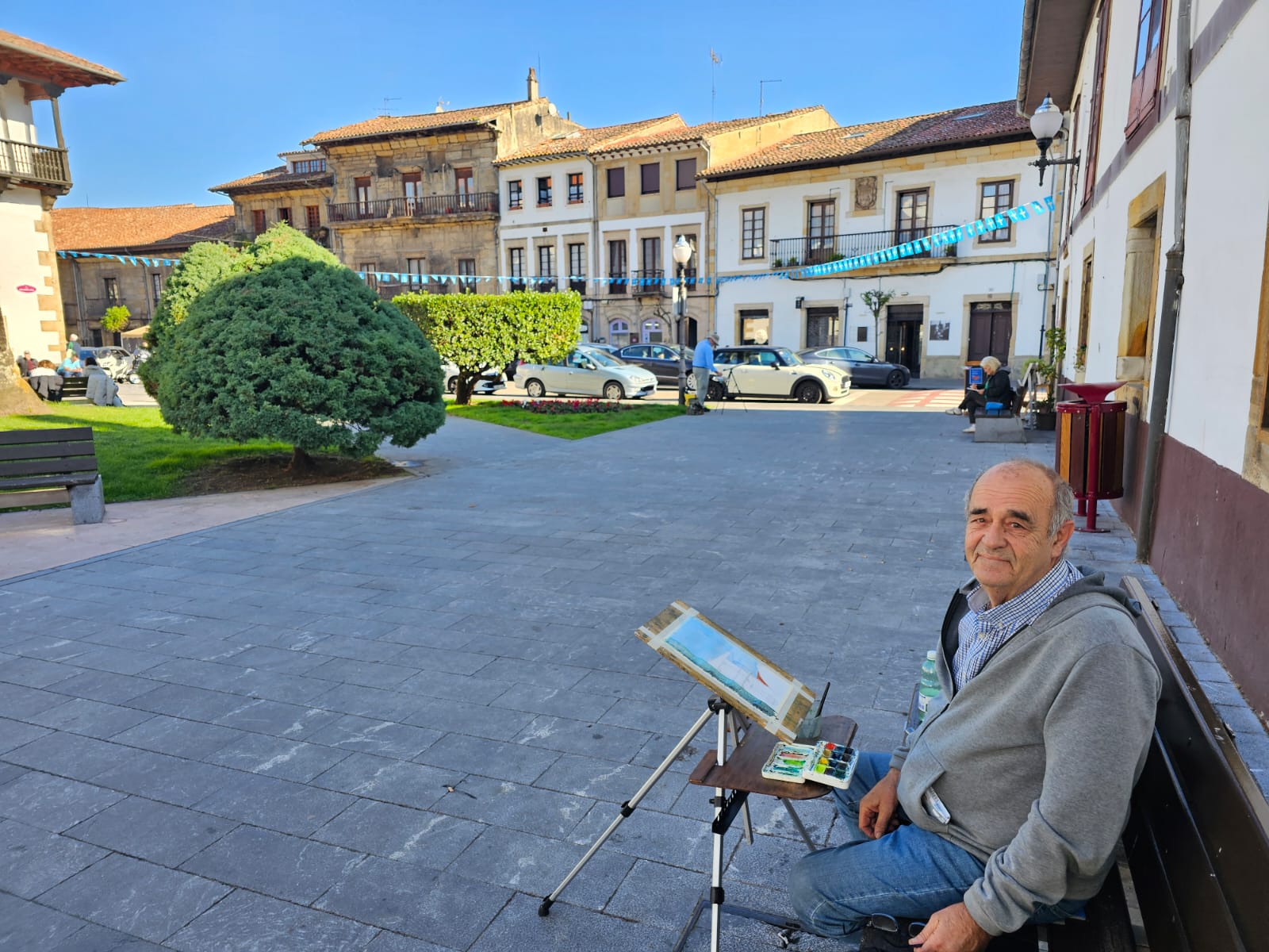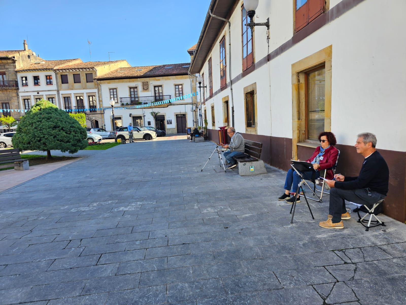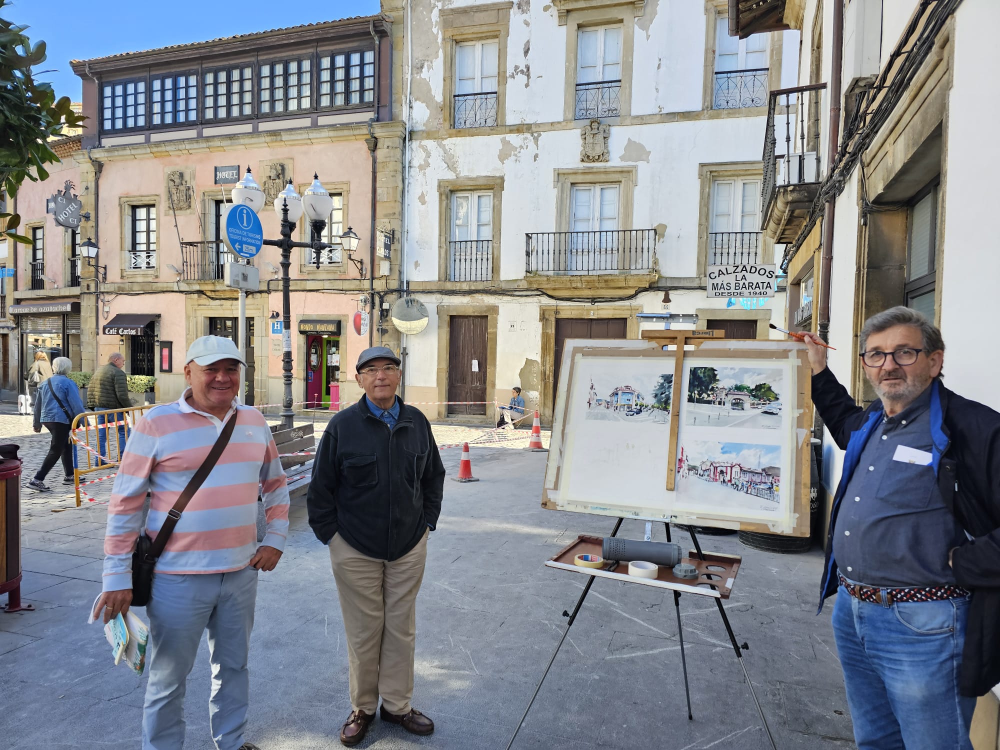 El pintor José Miguel Beneyto y otros pintores pintando la Plaza Caveda y Nava del casco histórico de Villaviciosa