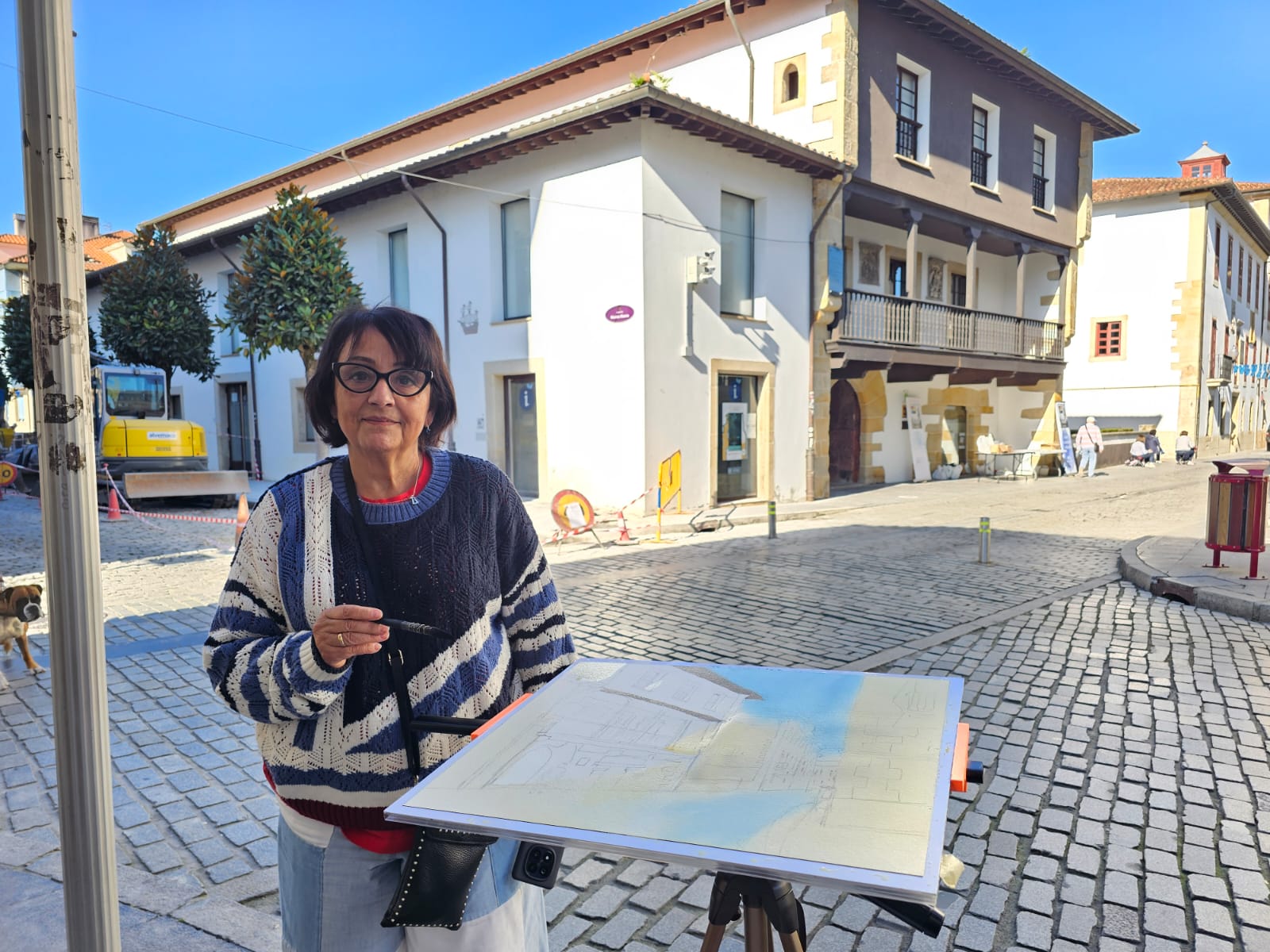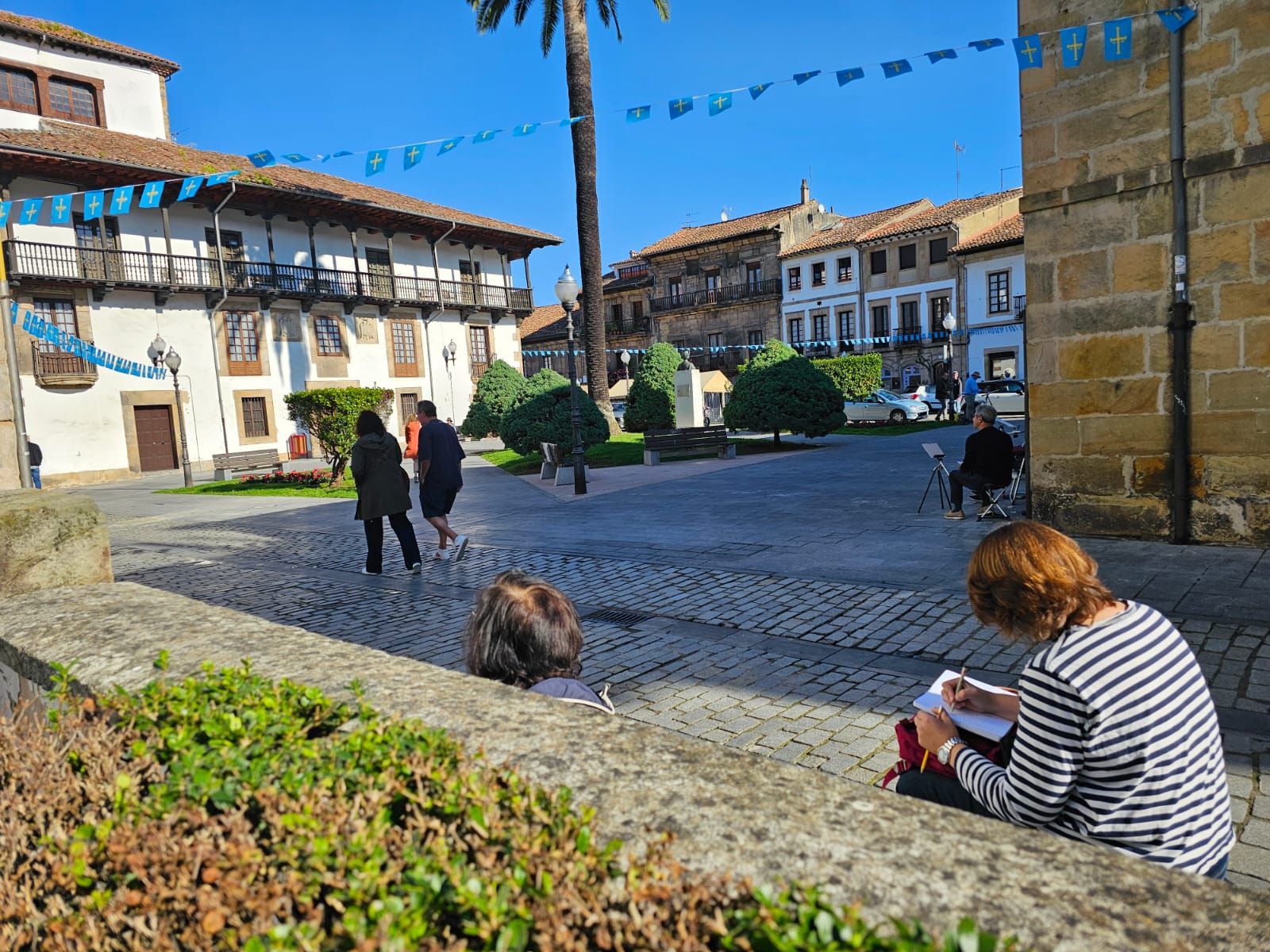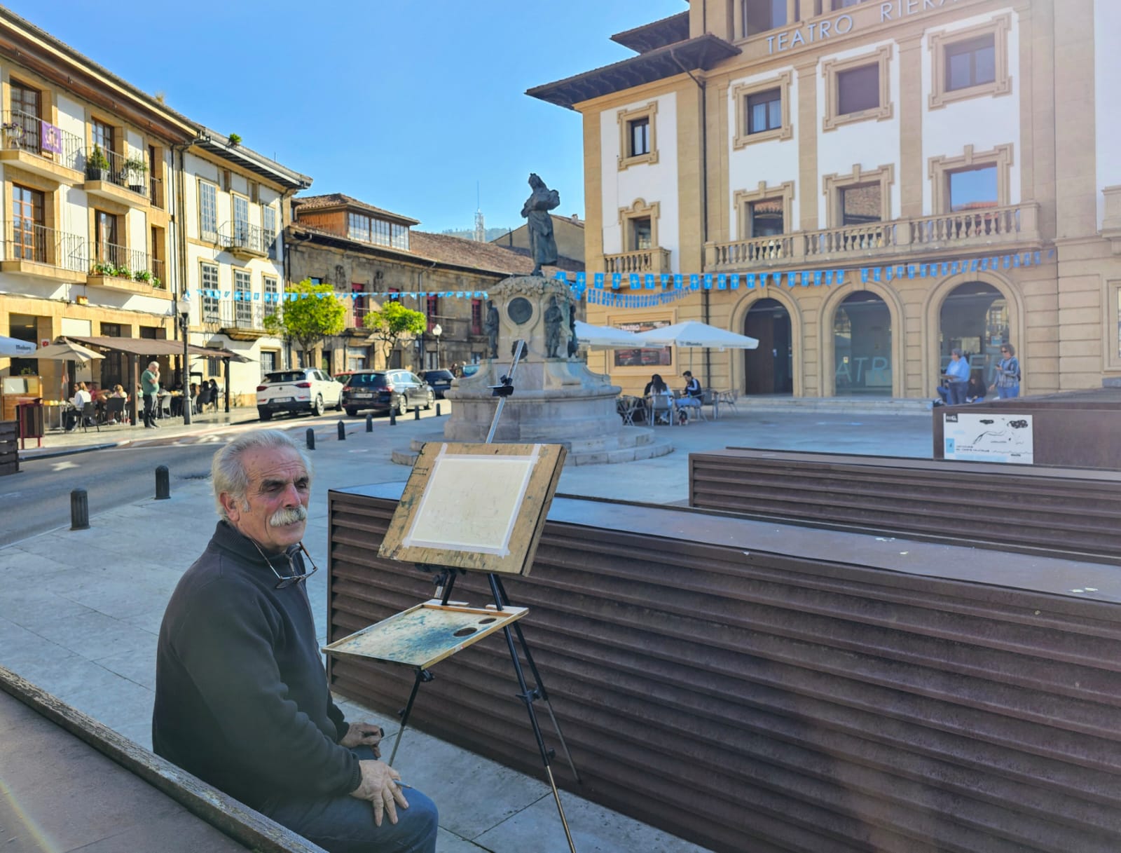 El pintor José Miguel Beneyto y otros pintores pintando la Plaza Caveda y Nava del casco histórico de Villaviciosa
