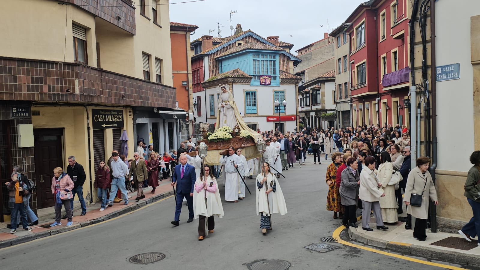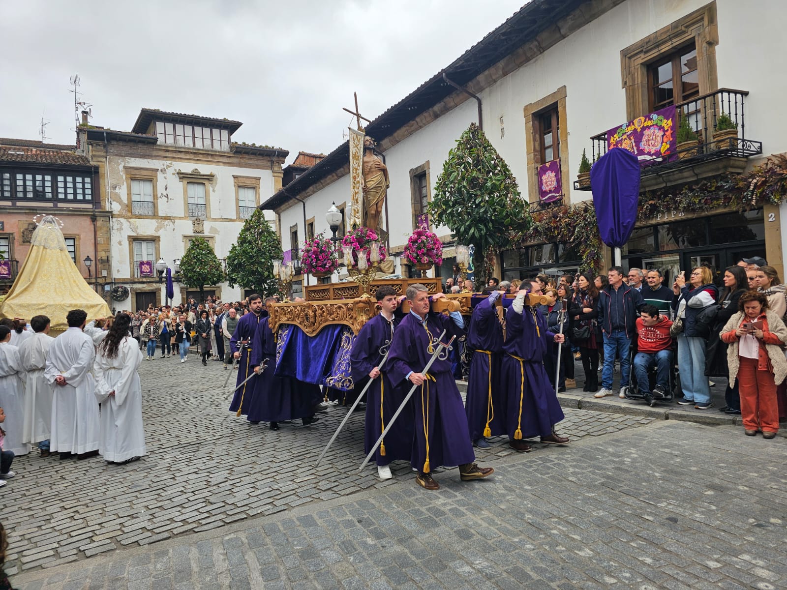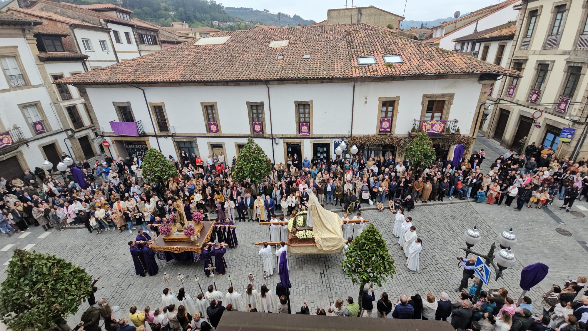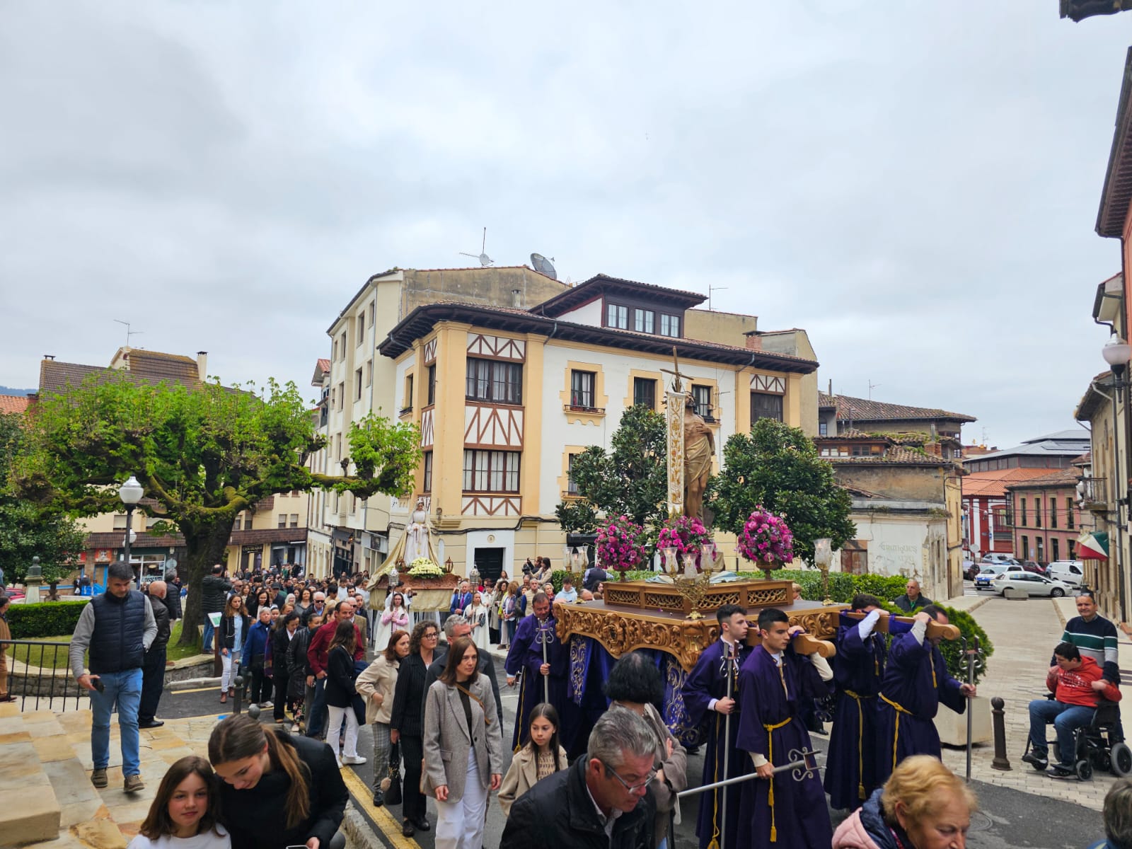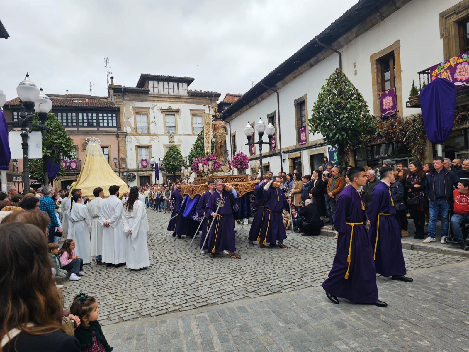 La jornada ha arrancado con dos comitivas partiendo desde puntos distintos: la iglesia parroquial y el templo de La Oliva. Al frente, la Banda de Gaites Villaviciosa El Gaitero ha marcado el ritmo de un recorrido que los asistentes han seguido en silencio, roto solo por la música y por la emoción contenida en muchos rostros. El momento culminante ha llegado en la plaza Carlos I: el encuentro entre Jesús Resucitado —que estrenaba nuevas andas— y la Virgen Nuestra Señora de la Paz. Un instante que, año tras año, se reafirma como el corazón de esta celebración.