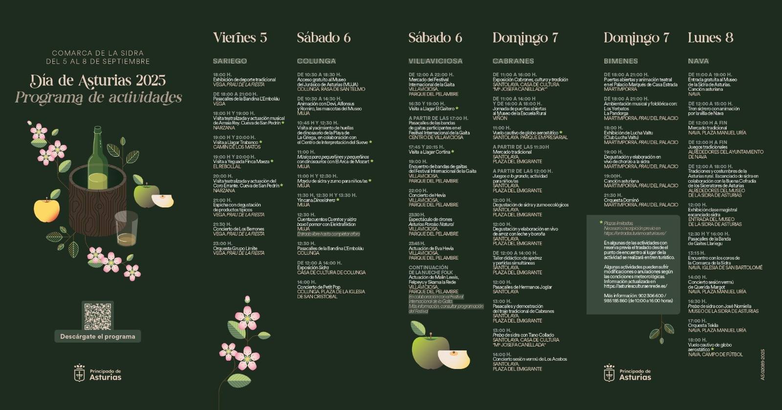 El Gobierno del Principado celebrará del 5 al 8 de septiembre los actos del Día de Asturias en los seis concejos que integran la Comarca de la Sidra: Bimenes, Cabranes, Colunga, Nava, Sariego y Villaviciosa. Este año, la festividad rinde homenaje a la cultura sidrera asturiana, recientemente reconocida por la UNESCO como Patrimonio Cultural Inmaterial de la Humanidad.