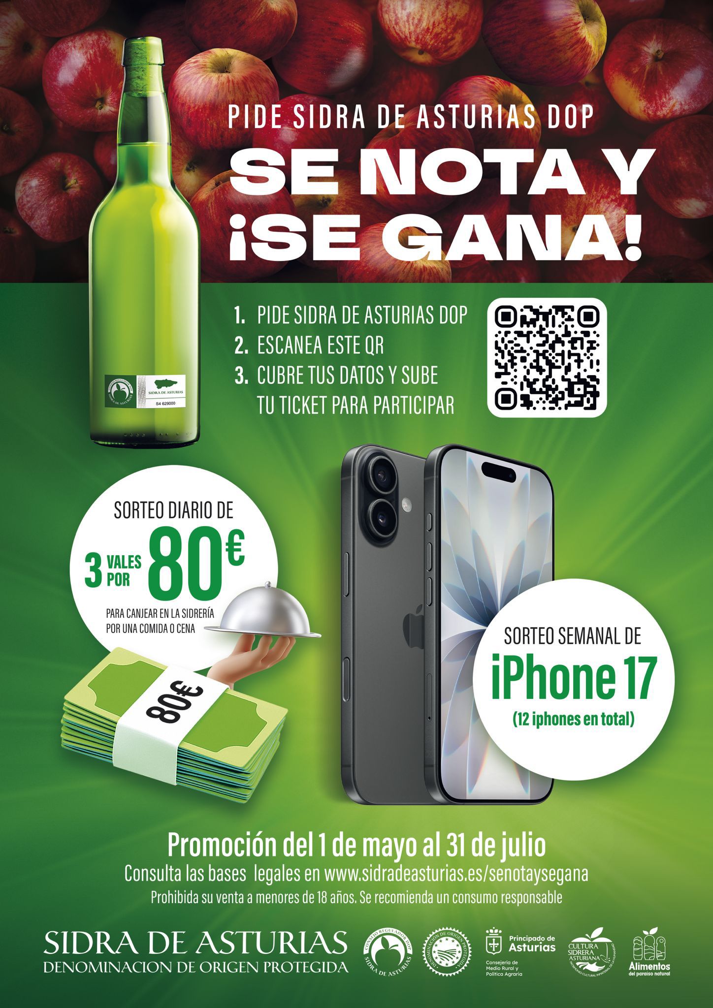 La campaña, que se desarrollará entre el 1 de mayo y el 31 de julio, repartirá más de 40.000 euros en premios, entre los que se incluyen 276 cenas valoradas en 80 euros en sidrerías y 12 iPhone 17 (uno a la semana).