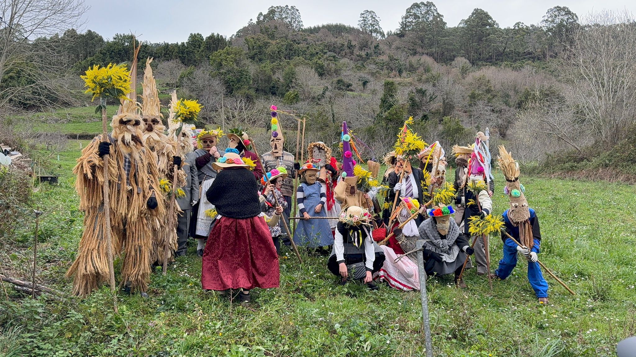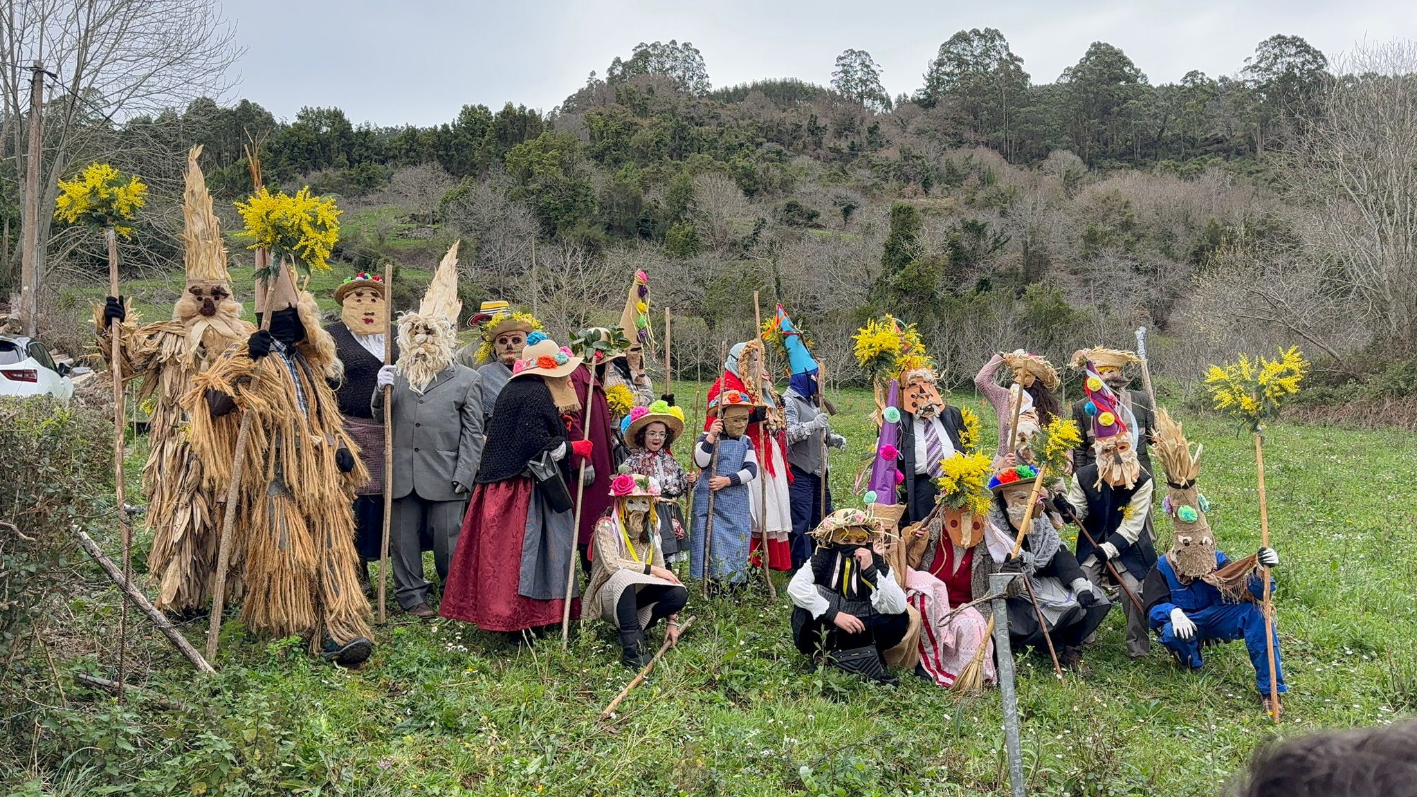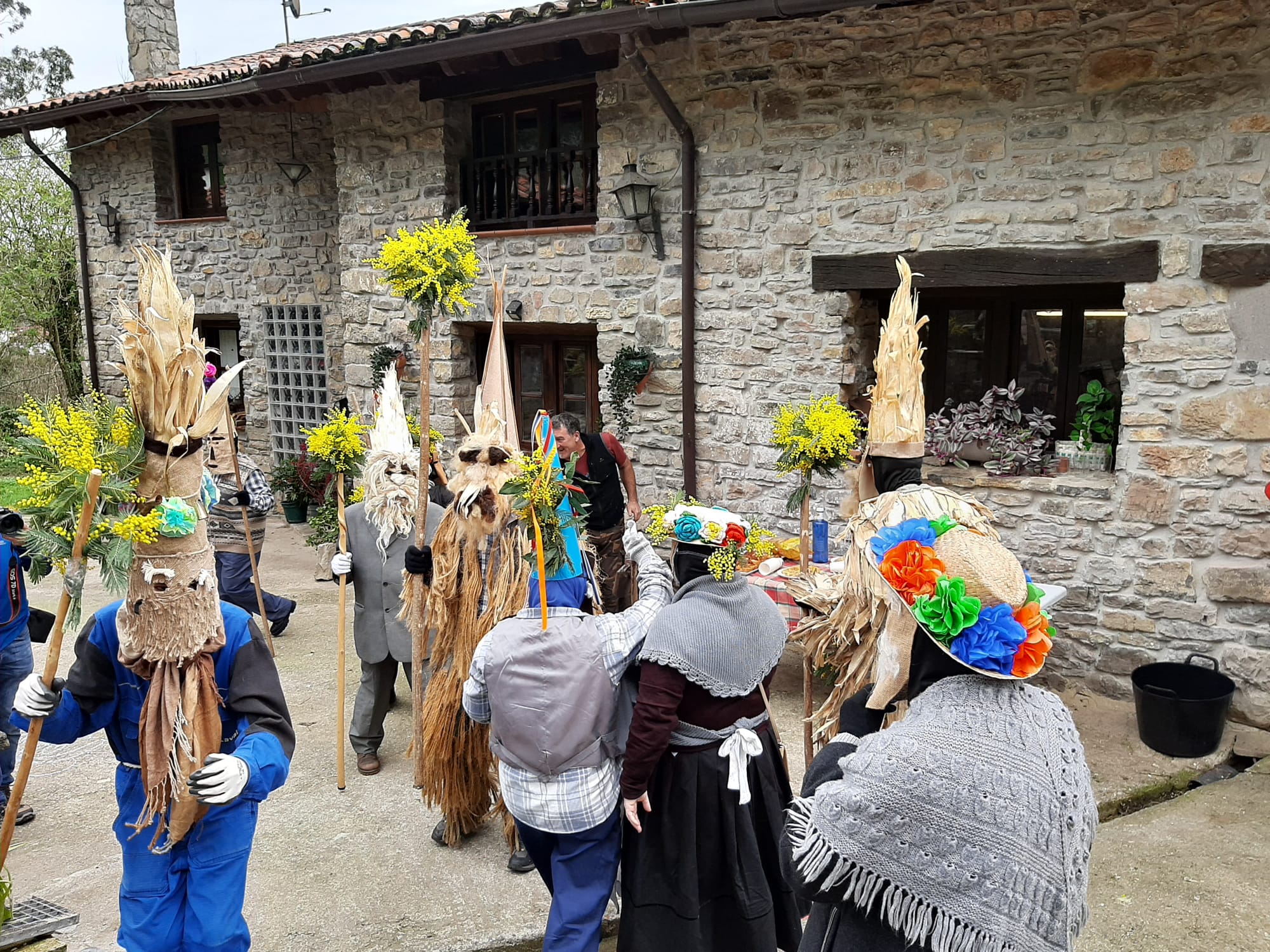 Uno de los aspectos más llamativos de la celebración fue la elaboración artesanal de las máscaras y adornos, confeccionados con elementos tradicionales del entorno rural. Ramos de mimosas, riestras de ajos y cebollas, hojas de panoya o de laurel, habituales en hórreos y huertas, y que formaron parte de una estética que remite a los orígenes de esta manifestación popular. “Aquí la gente siempre echó mucha imaginación, utilizando la ropa y los elementos antiguos que había por casa”, explican desde la asociación vecinal Roberto Díaz y Loli Díaz Sopeña.