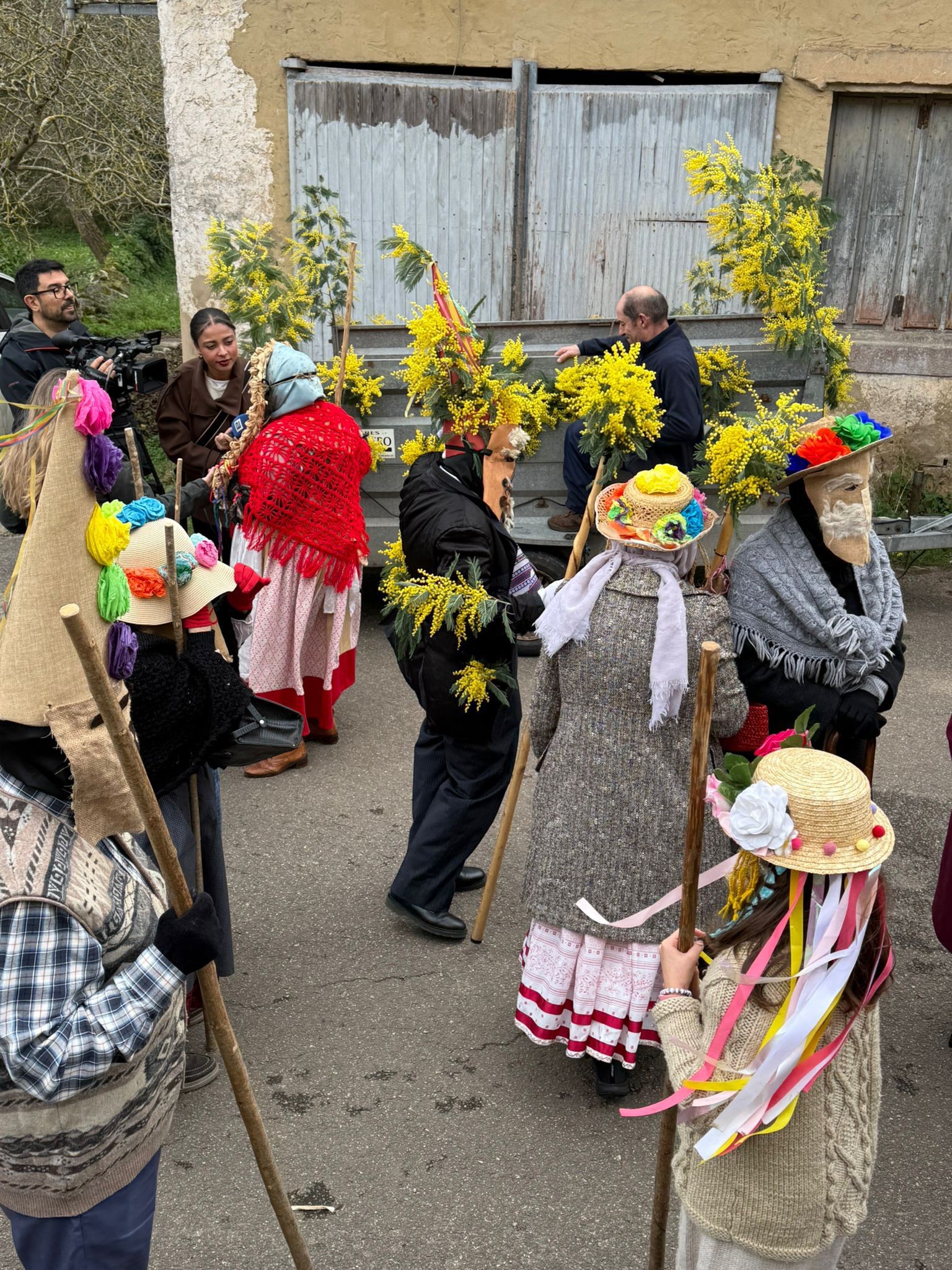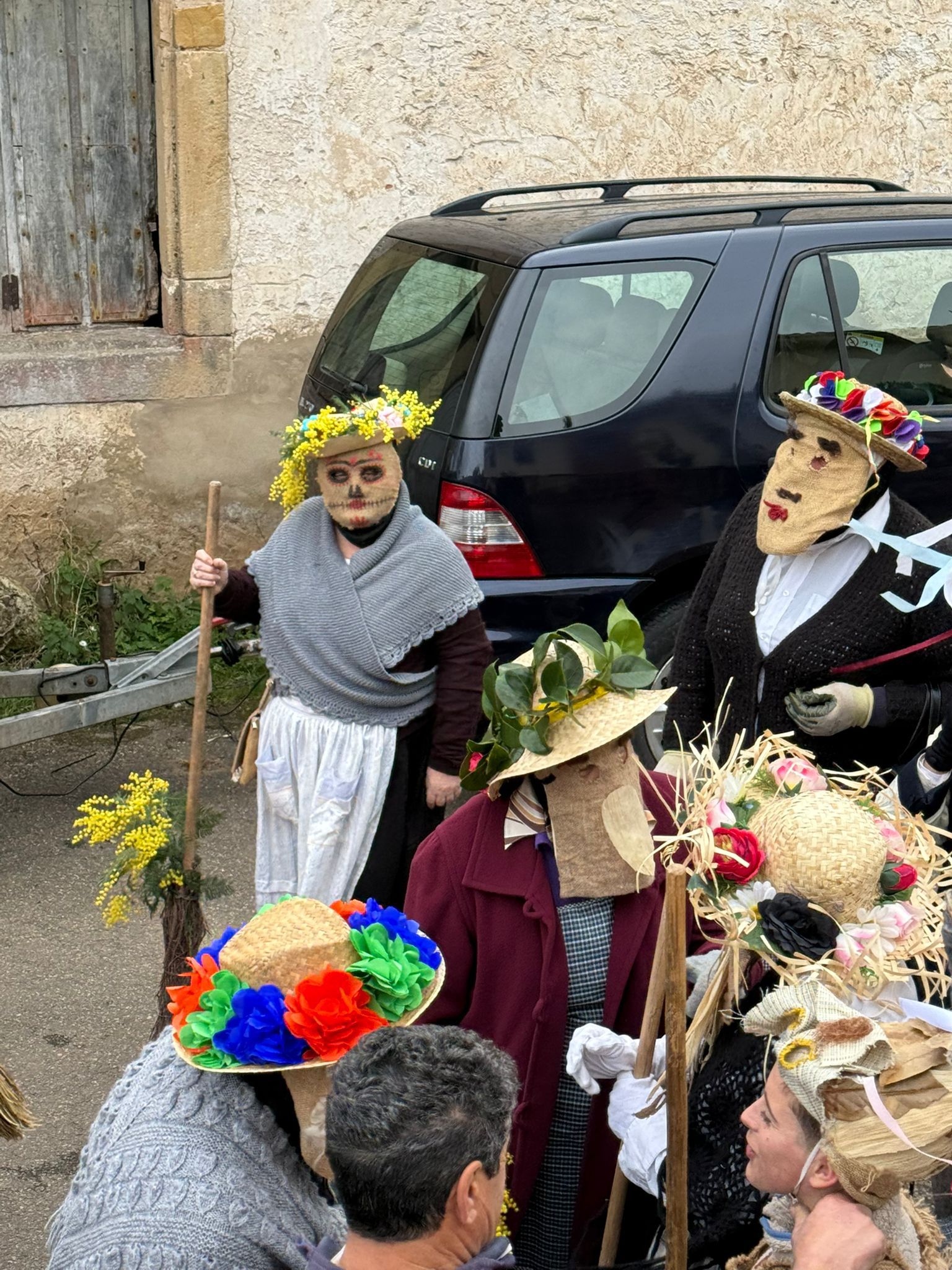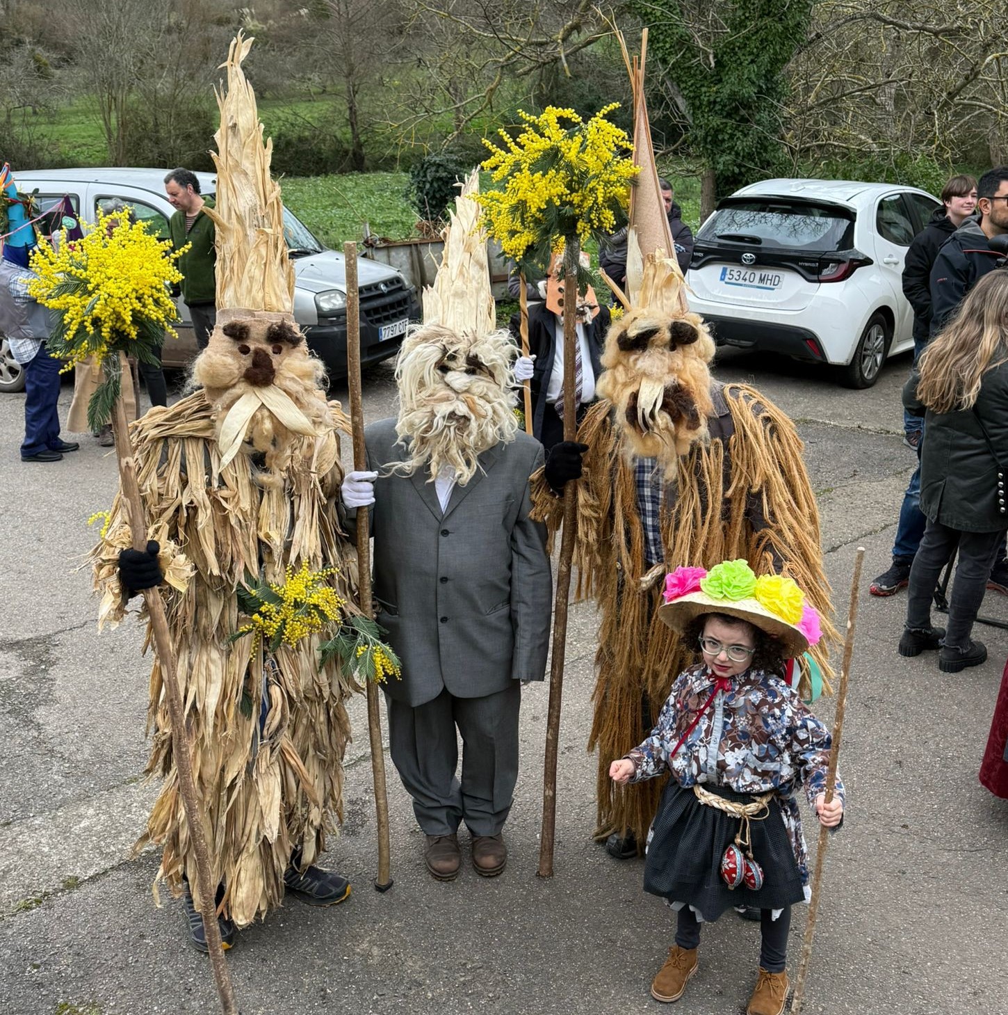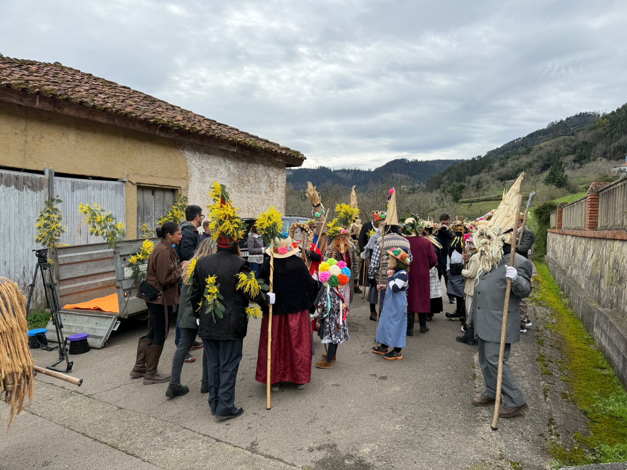 Uno de los aspectos más llamativos de la celebración fue la elaboración artesanal de las máscaras y adornos, confeccionados con elementos tradicionales del entorno rural. Ramos de mimosas, riestras de ajos y cebollas, hojas de panoya o de laurel, habituales en hórreos y huertas, y que formaron parte de una estética que remite a los orígenes de esta manifestación popular. “Aquí la gente siempre echó mucha imaginación, utilizando la ropa y los elementos antiguos que había por casa”, explican desde la asociación vecinal Roberto Díaz y Loli Díaz Sopeña.