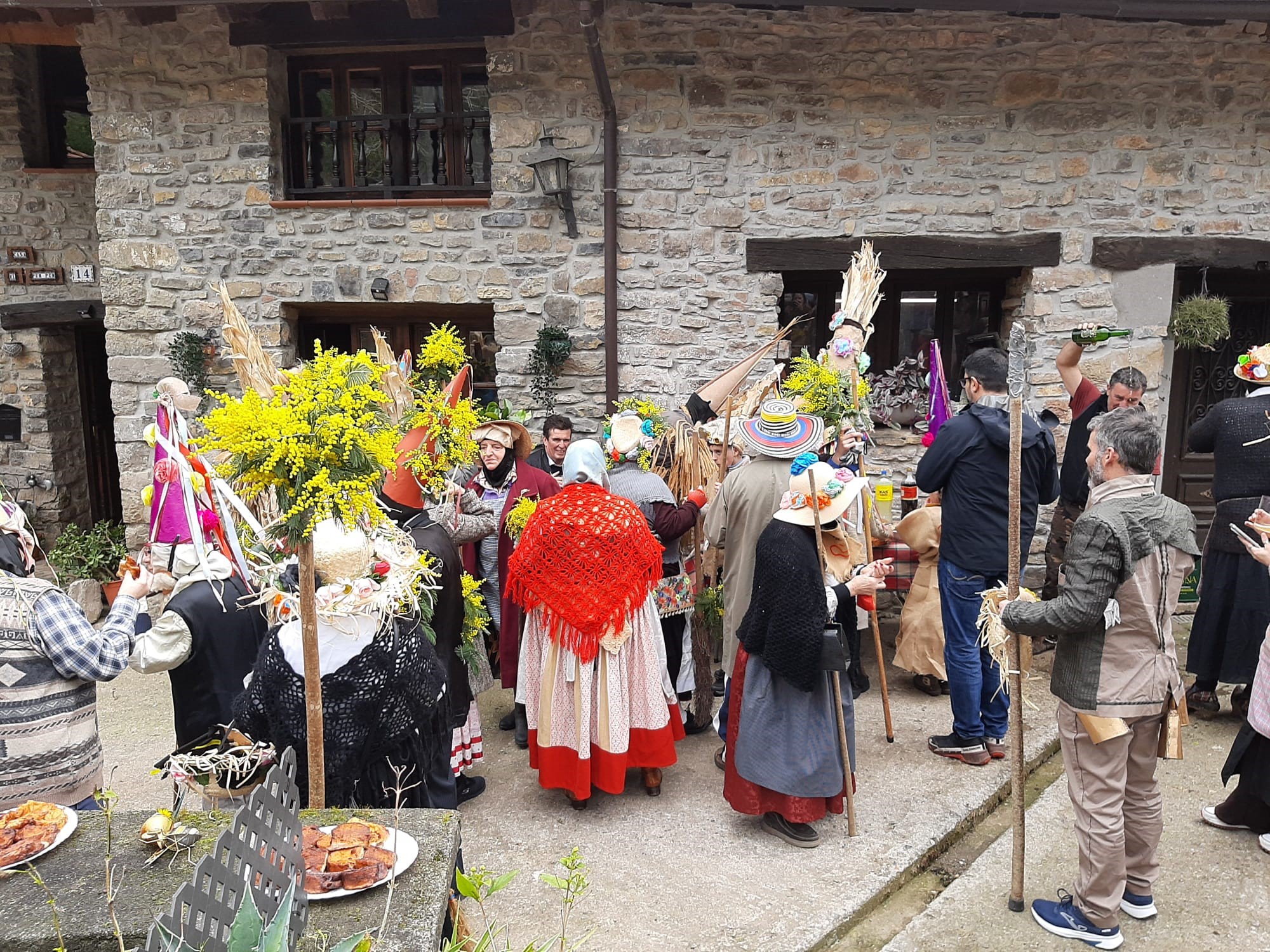 Como marca la costumbre, los mazcaraos iban “asustando” a los vecinos, que respondían convidando a los participantes con dulces típicos del Antroxu, como fayueles y picatostes, además de tortillas y sidra, que aguardaban en las puertas de las casas.