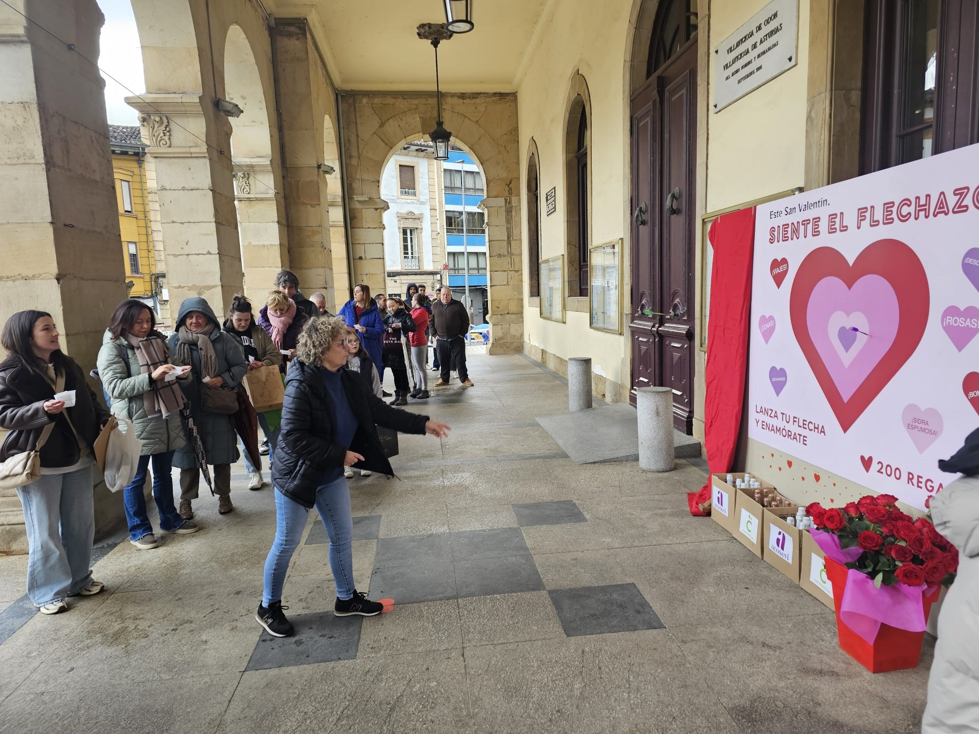El acto principal se celebró ayer entre las 12 y las 14 horas, con los soportales del Ayuntamiento convertidos, ante la amenaza de lluvia, en un espacio lleno de ambiente festivo, presidido por una gran diana con forma de corazón. En ella se ilustraban los tres pilares de la economía local —comercio, hostelería y servicios—, invitando a los asistentes a “lanzar su flecha y ganar premio”.