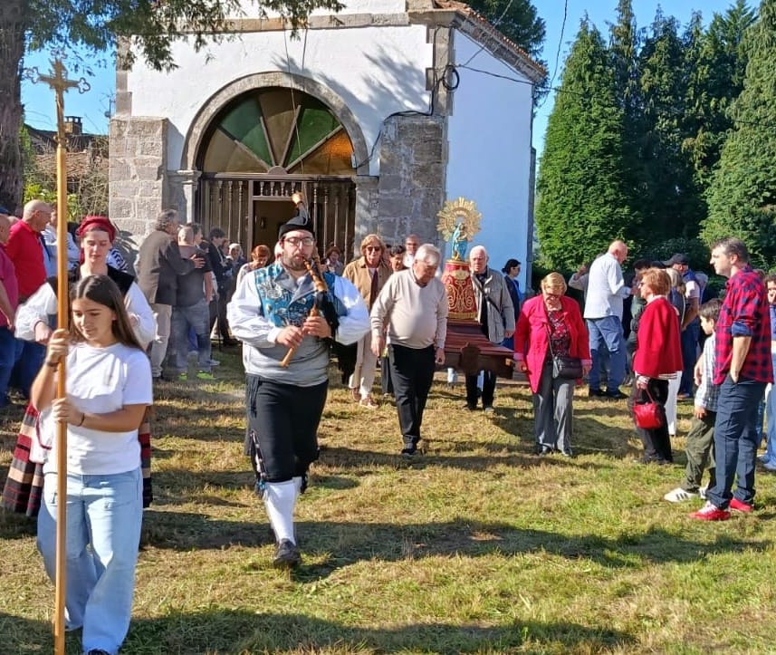 Lluaria también vivió ayer su día grande en honor a su patrona. La jornada comenzó con misa cantada por el Coro Valdediós procesión con gaita y tambor y la tradicional subasta del ramu. A continuación, se repartieron los bollos de La Pilarica y botellas de sidra entre los socios en el prau de la fiesta, donde tuvo lugar una comida popular bajo la carpa instalada para la ocasión