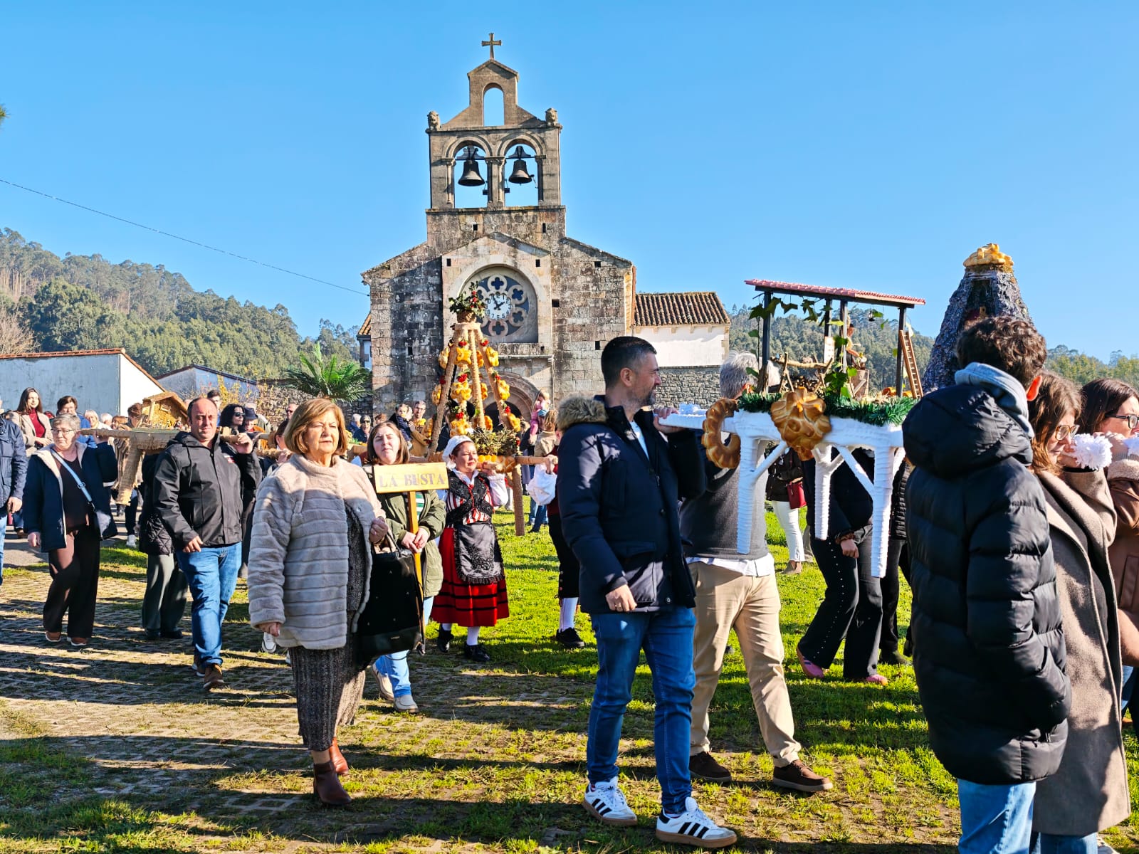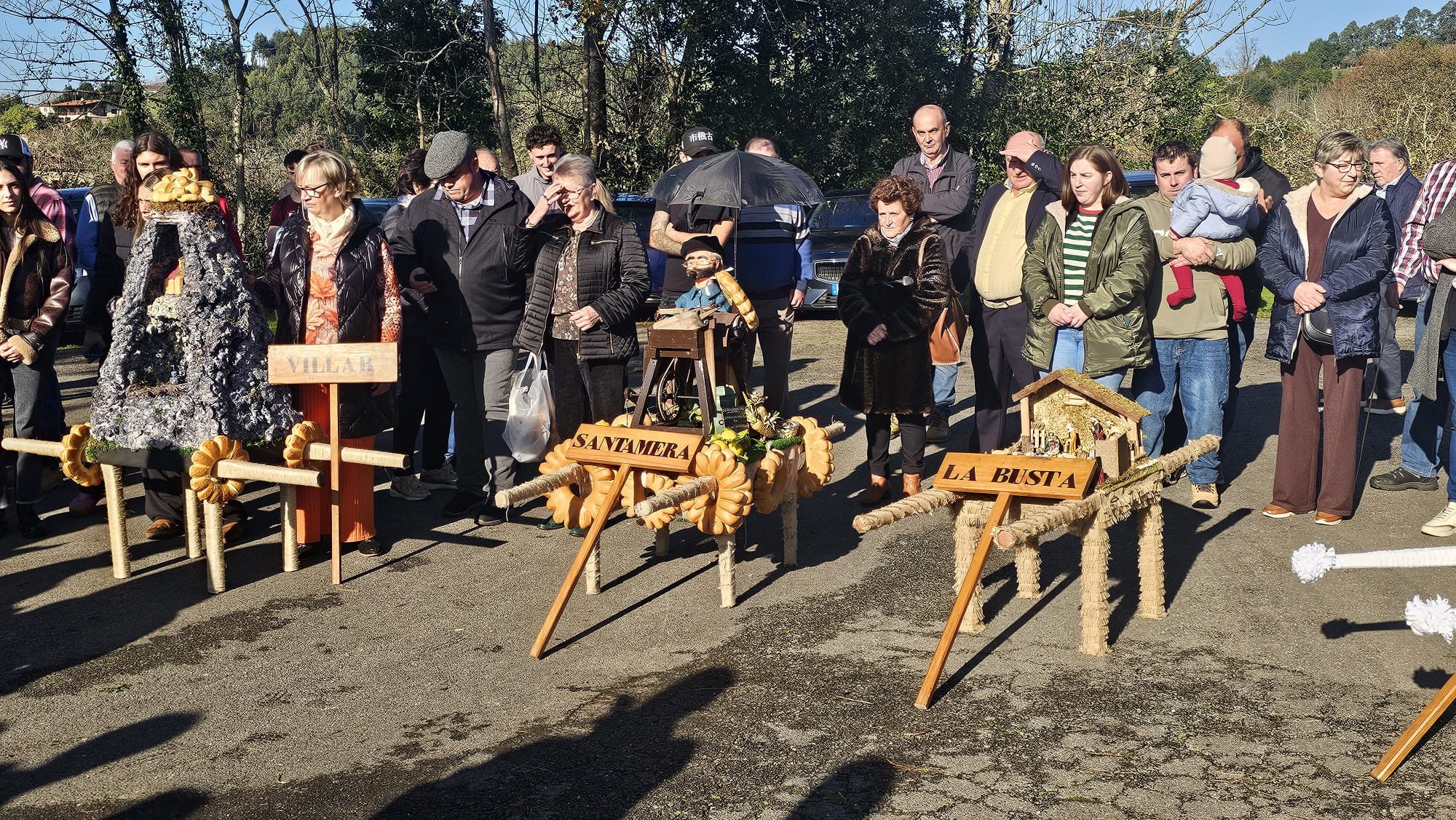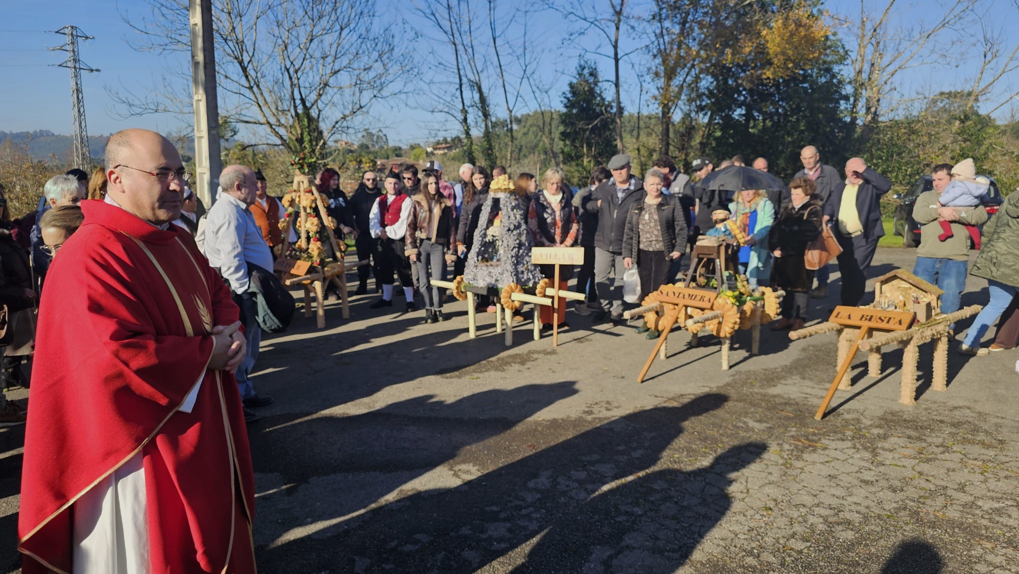 La celebración comenzó a las 12:00 horas con el desfile de siete ramos, elaborados por los distintos barrios y familias de la parroquia. Este año participaron los ramos de La Busta, Santamera, Villar, Olivar, El Terienzu y La Caí, además del de la Asociación de Vecinos. Como marca la tradición, cada ramo recorrió el camino desde su barrio en compañía de mayores y niños, en procesión hasta la Iglesia Parroquial de Santa Eulalia.