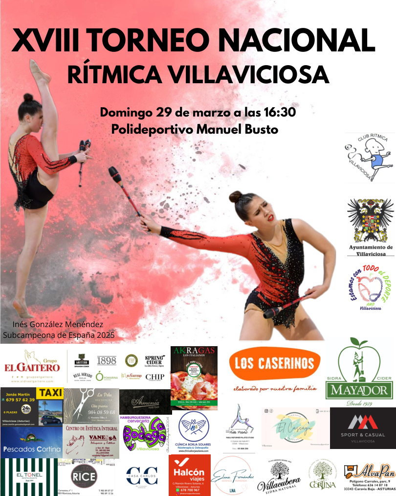 El próximo Domingo 29 de marzo a partir de las 15:00 horas se celebrará el XVIII Torneo Nacional de Rítmica en el Polideportivo Municipal Manuel Busto de Villaviciosa.
