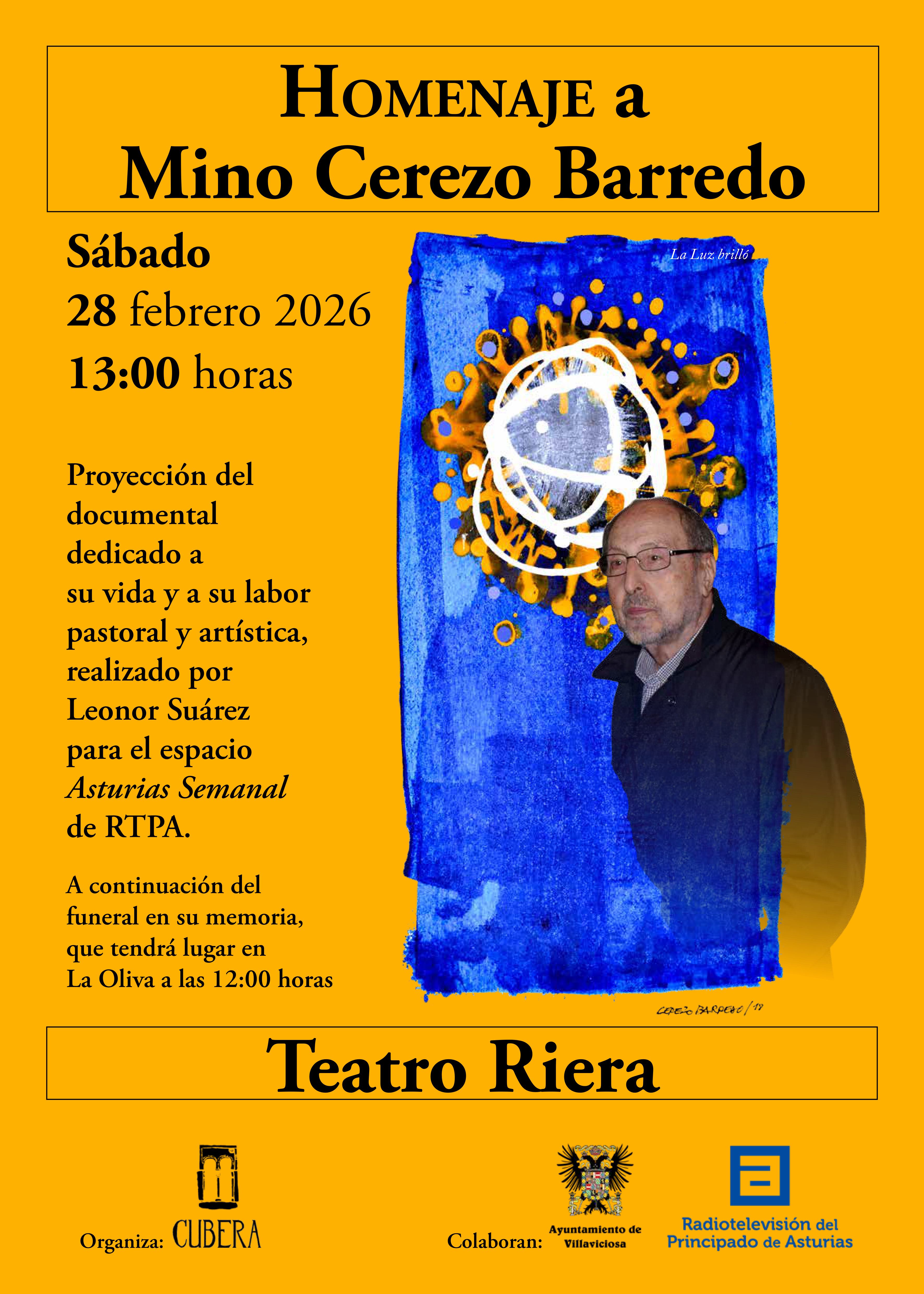 Este próximo sábado día 28 hemos programado la proyección en el Teatro Riera del documental sobre Mino Cerezo Barredo, realizado por Leonor Suárez para el programa Asturias Semanal de la TPA. Cubera se suma de esta forma al homenaje que ese día se dedica en Villaviciosa a este misionero y pintor, que dará comienzo con un funeral en su memoria a las 12:00 en la iglesia de La Oliva.