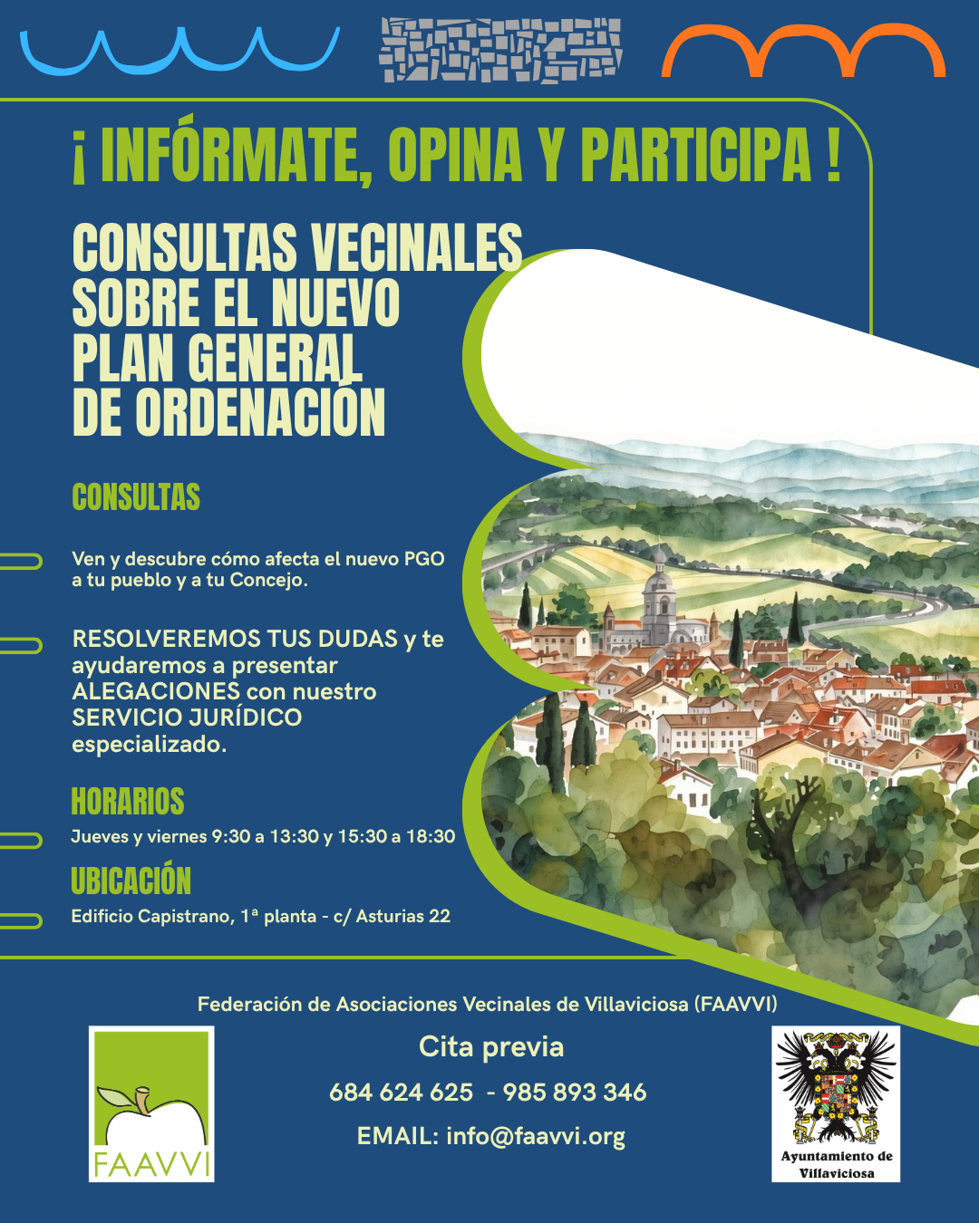 La Federación de Asociaciones Vecinales de Villaviciosa (FAAVVI) viene desarrollando trabajos de seguimiento del nuevo Plan General de Ordenación, desde el inicio, personándose, formulando alegaciones previas, asistiendo a las reuniones de la Comisión y todo lo que conlleva, en defensa de los intereses generales, tal y como tiene encomendado en sus funciones. El pasado mes de marzo aprobó en Junta Directiva continuar las tareas entre las que se encuentra iniciar la segunda fase del servicio básico de atención al ciudadano orientado a la información urbanística con el fin de asesorar a los vecinos y a las AAVV.